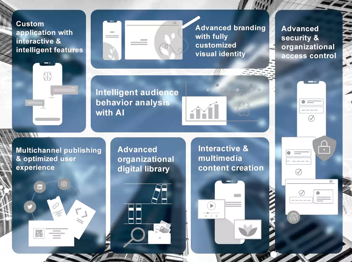 Support for adding videos, audio, podcasts, animations, and 3D images along with interactive forms and functional links to create engaging and dynamic digital content tailored to organizational needs.