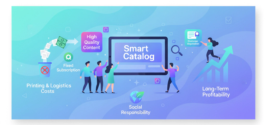 بزرگترین صرفه‌جویی در نشر دیجیتال، جلوگیری از ضرر ناشی از چاپ اطلاعات منسوخ است. وقتی قیمت‌ها یا موجودی محصولات تغییر می‌کند، نسخه‌های چاپی دیگر قابل استفاده نیستند و هزینه‌ای که صرف آن‌ها شده، مستقیماً به زیان سازمان تبدیل می‌شود. کاتالوگ هوشمند با به‌روزرسانی آنی این ضرر را به طور کامل حذف می‌کند.